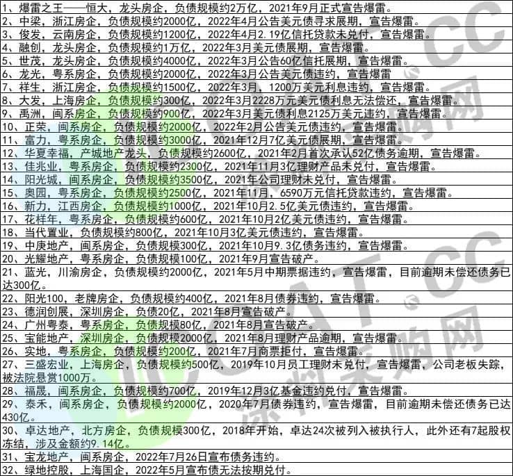 前有恒大集團“清算呈請”,后有世茂集團“巨額債務爆雷”,房地產行業的爆雷和違約已經變成了“家常便飯”,多家千億巨頭也被波及。2022年已過半,大多數房企公司都在收縮、躺平、降價、回款自救,據涂料采購網不完全統計,目前已有30多家房企“爆雷”,債務違約者比比皆是。