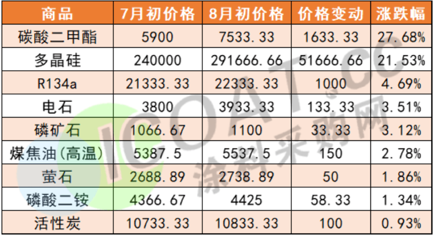 活性炭目前報價10833.33元/噸,較7月初報價環比上漲100元/噸,漲幅0.93%;部分化工品價格環比上漲數據