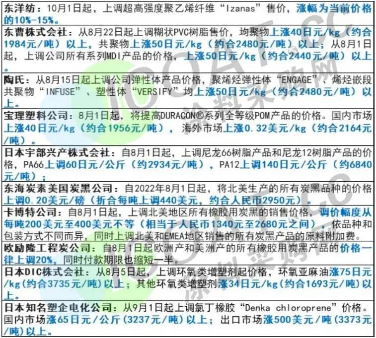 國內化工市場小幅回調的同時,海外龍頭的漲勢更是驚人,陶氏、東曹、炭黑三巨頭等多家化工企業陸續發函宣漲,產品包括橡膠、樹脂、聚烯烴彈性體、炭黑等,噸價最高上漲近7000元,且部分企業的漲價安排已經涉及了9月甚至10月的范疇,可謂是未雨綢繆。