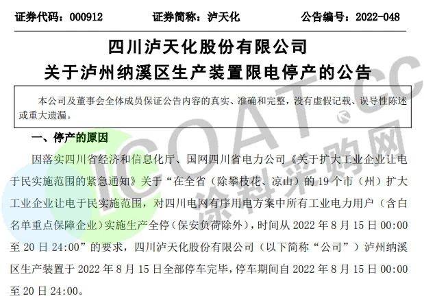 氯堿龍頭天原股份:四川境內(nèi)子公司部分產(chǎn)能按照要求于2022年8月15日至8月20日24時(shí)臨時(shí)停產(chǎn)一周。