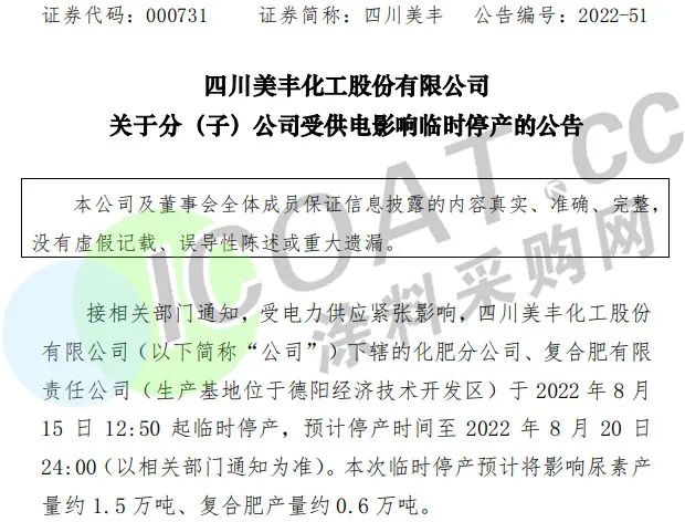 化肥龍頭四川美豐:分(子)公司受供電影響臨時(shí)停產(chǎn),本次臨時(shí)停產(chǎn)預(yù)計(jì)將影響尿素產(chǎn)量約1.5萬(wàn)噸、復(fù)合肥產(chǎn)量約0.6萬(wàn)噸。