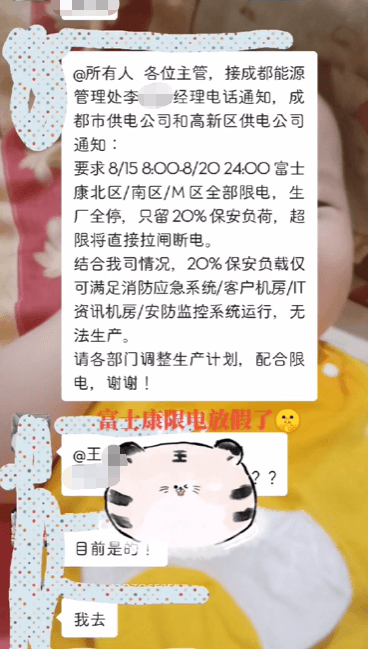 成都富士康從15日至20日限電,僅保留20%保安負(fù)載,全廠生產(chǎn)停止。生產(chǎn)線員工表示,已接到休息通知。富士康方面回應(yīng)稱,目前對(duì)其運(yùn)營(yíng)影響不大。