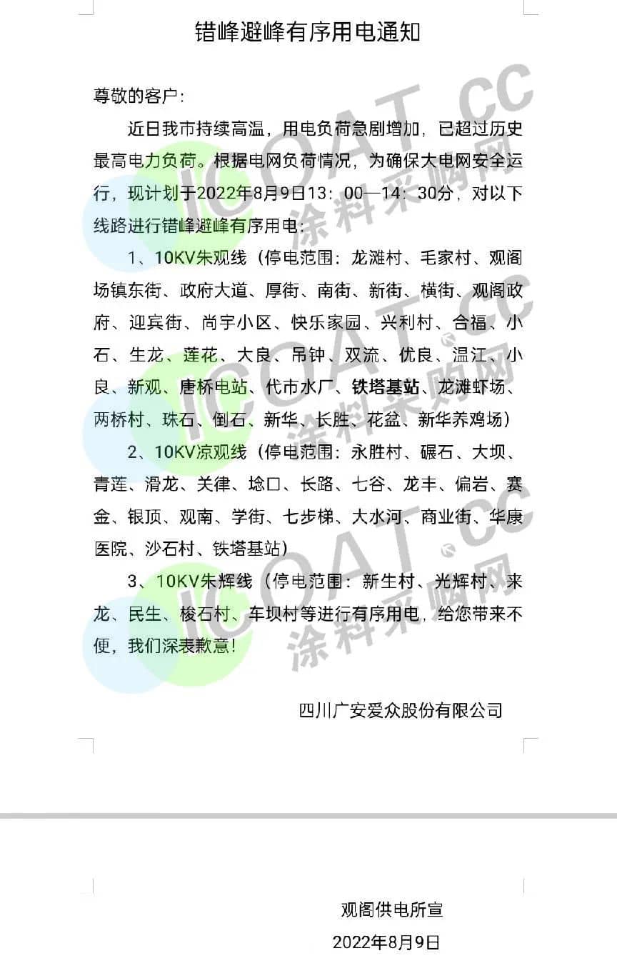 四川廣安愛(ài)眾股份觀閣供電所發(fā)布《錯(cuò)峰避峰有序用電通知》,現(xiàn)計(jì)劃于2022年8月8日13∶00-14∶30分,對(duì)部分線路進(jìn)行錯(cuò)峰避峰有序用電,另一部分進(jìn)行有序用電。
