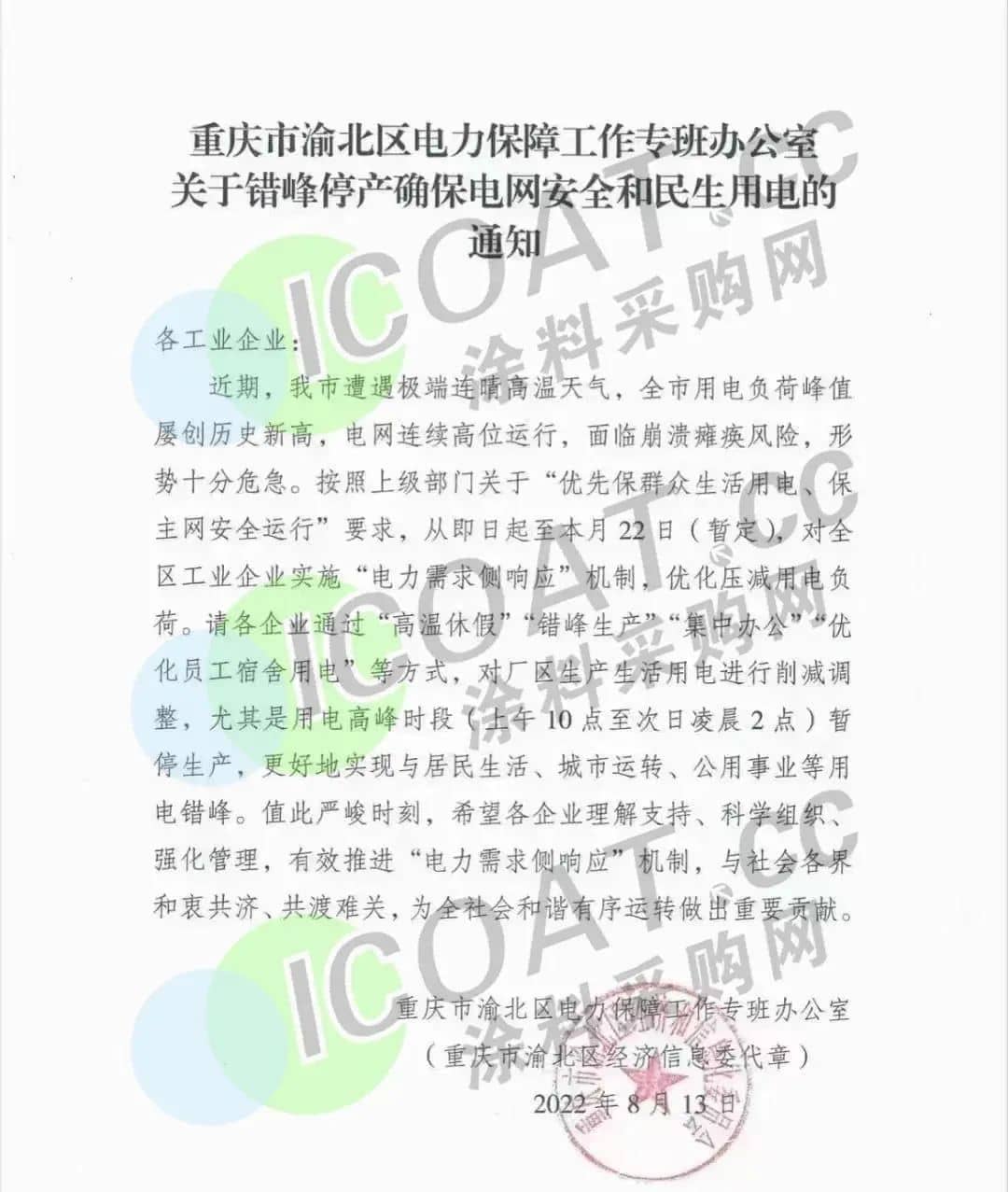 重慶市渝北區(qū)發(fā)布《關(guān)于錯(cuò)峰停產(chǎn)確保電網(wǎng)安全和民生用電的通知》,從即日起至本月22日(暫定),對(duì)全區(qū)工業(yè)企業(yè)實(shí)施“電力需求側(cè)響應(yīng)”機(jī)制。請(qǐng)各企業(yè)通過(guò)“高溫休假”、“錯(cuò)峰生產(chǎn)”、“集中辦公”、“優(yōu)化員工宿舍用電”等方式,對(duì)廠區(qū)生產(chǎn)生活用電進(jìn)行削減調(diào)整,尤其是用電高峰時(shí)段(上午10點(diǎn)至次日凌晨2點(diǎn))暫停生產(chǎn),更好地實(shí)現(xiàn)與居民生活、城市運(yùn)轉(zhuǎn)、公用事業(yè)等用電錯(cuò)峰。