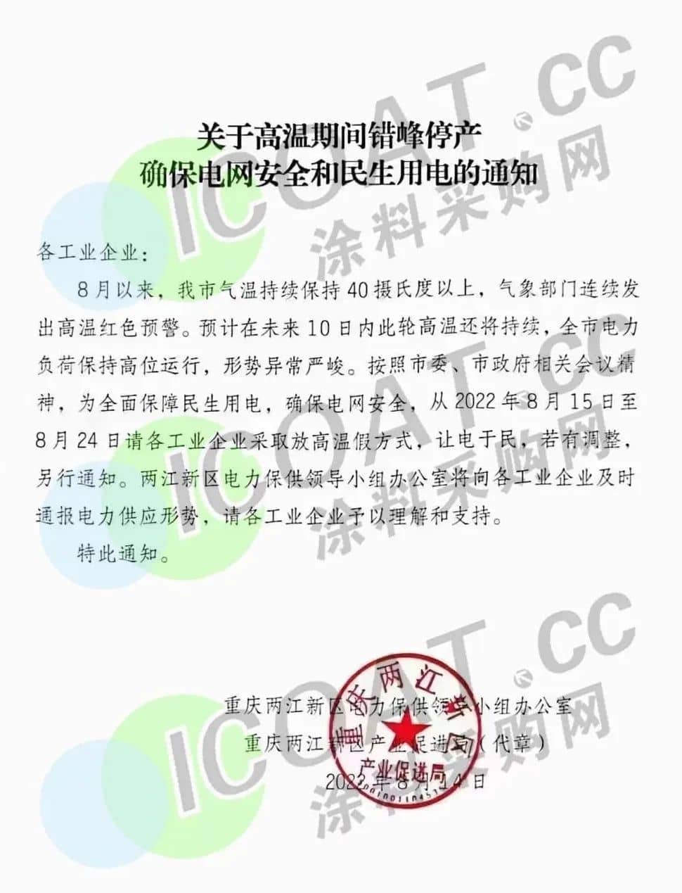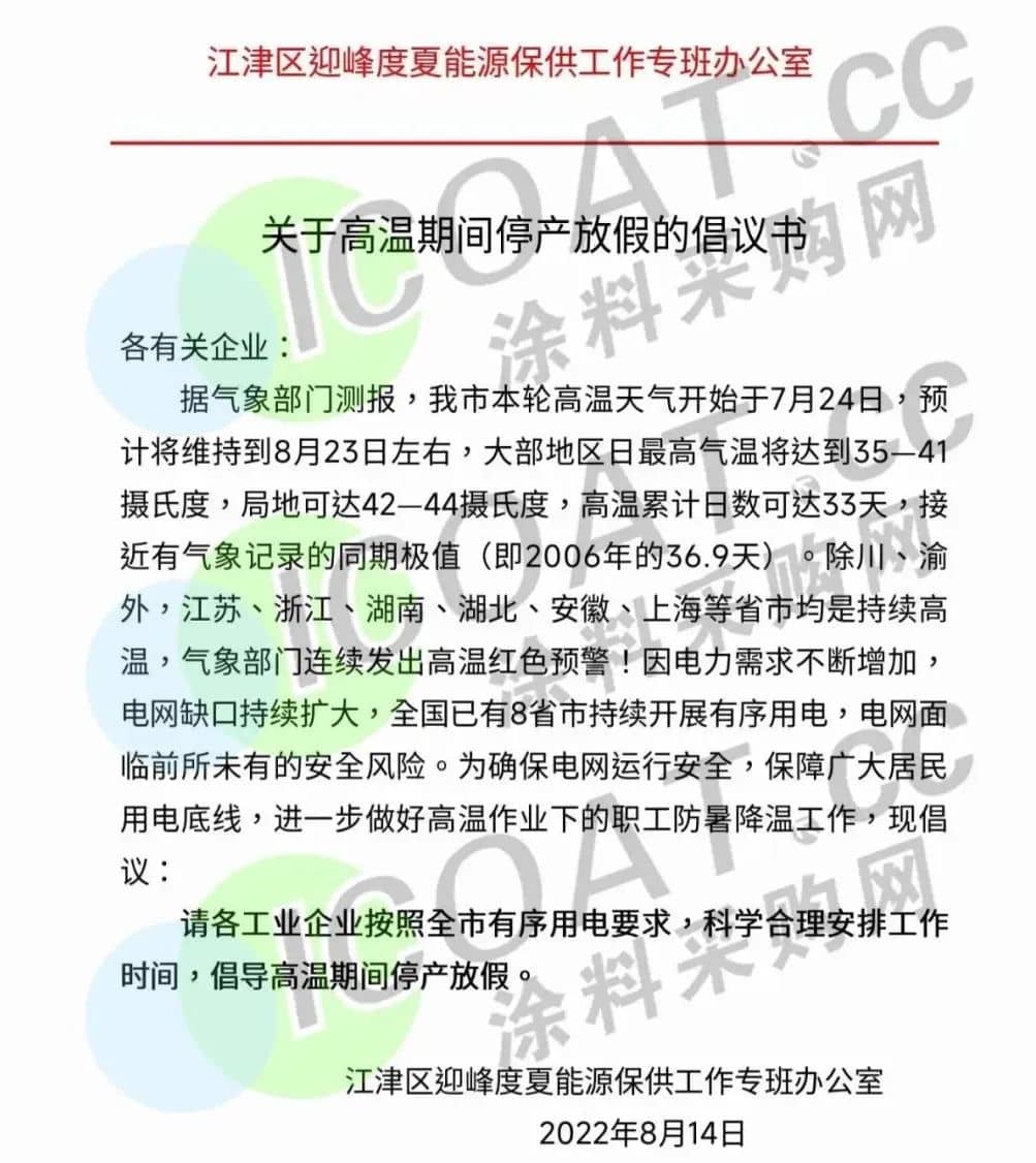 重慶兩江新區(qū)《關(guān)于高溫期間錯(cuò)峰停產(chǎn)確保電網(wǎng)安全和民生用電的通知》稱,從2022年8月15日至8月24日請(qǐng)各工業(yè)企業(yè)采取放高溫假方式,讓電于民。
