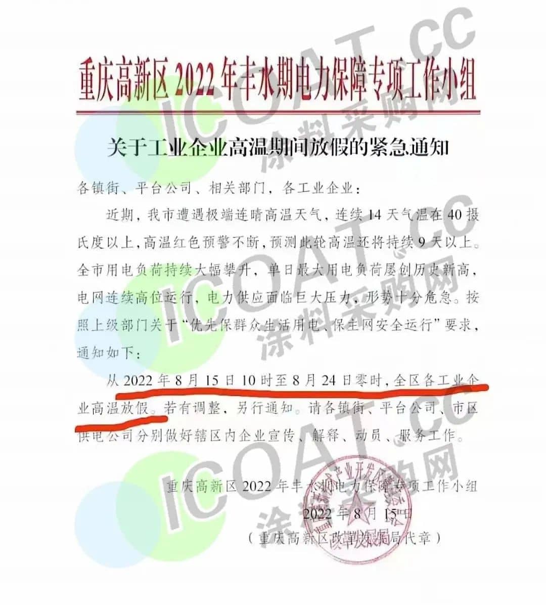 重慶高新區(qū)發(fā)布《關(guān)于工業(yè)企業(yè)高溫期間放假的緊急通知》稱,從2022年8月15日10時(shí)至8月24日零時(shí),全區(qū)各工業(yè)企業(yè)高溫放假。若有調(diào)整,另行通知。