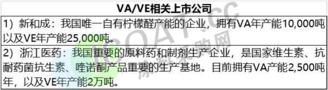 全球VA產能合計約3.39萬噸,主要集中在新和成、帝斯曼、巴斯夫、浙江醫藥等,其中帝斯曼、巴斯夫與安迪蘇均在歐洲建設工廠,合計產能達到全球產能的57%。