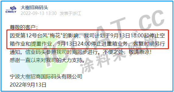 大榭招商碼頭計劃于9月13日18:00起停止空箱作業和提重作業,9月13日24:00停止進重箱業務,恢復時間另行通知。信業碼頭同步進行。