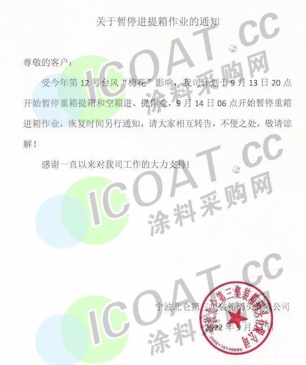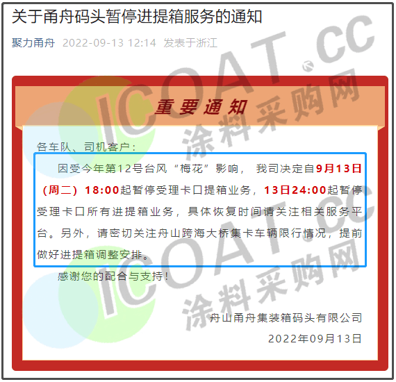 甬舟碼頭、大麥嶼港決定自9月13日(周二)18:00起暫停受理卡口提箱業務,13日24:00起暫停受理卡口所有進提箱業務。