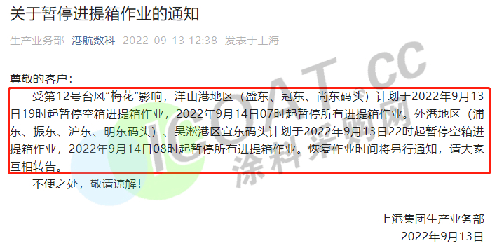 上海洋山港區(盛東、冠東、尚東碼頭)計劃于2022年9月13日19時起暫停空箱進提箱作業,2022年9月14日07時起暫停所有進提箱作業。外港地區(浦東、振東、滬東、明東碼頭)、吳淞港區宜東碼頭計劃于2022年9月13日22時起暫停空箱進提箱作業,2022年9月14日08時起暫停所有進提箱作業。