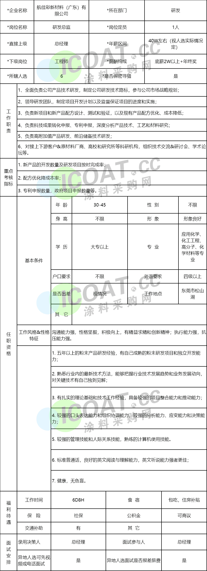 為提升企業的技術技術研發能力,航佳彩新材料(廣東)有限公司聯合中航工業在松山湖打造創新研發中心,進行高端粉末涂料的技術研發。為了進一步提升航佳彩新材料的技術研發能力,面向全行業誠聘研發總監一人,航佳新材料為您展示自我才華的強平臺,實現您的人生價值。