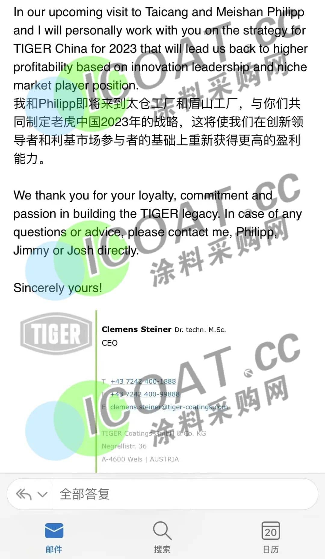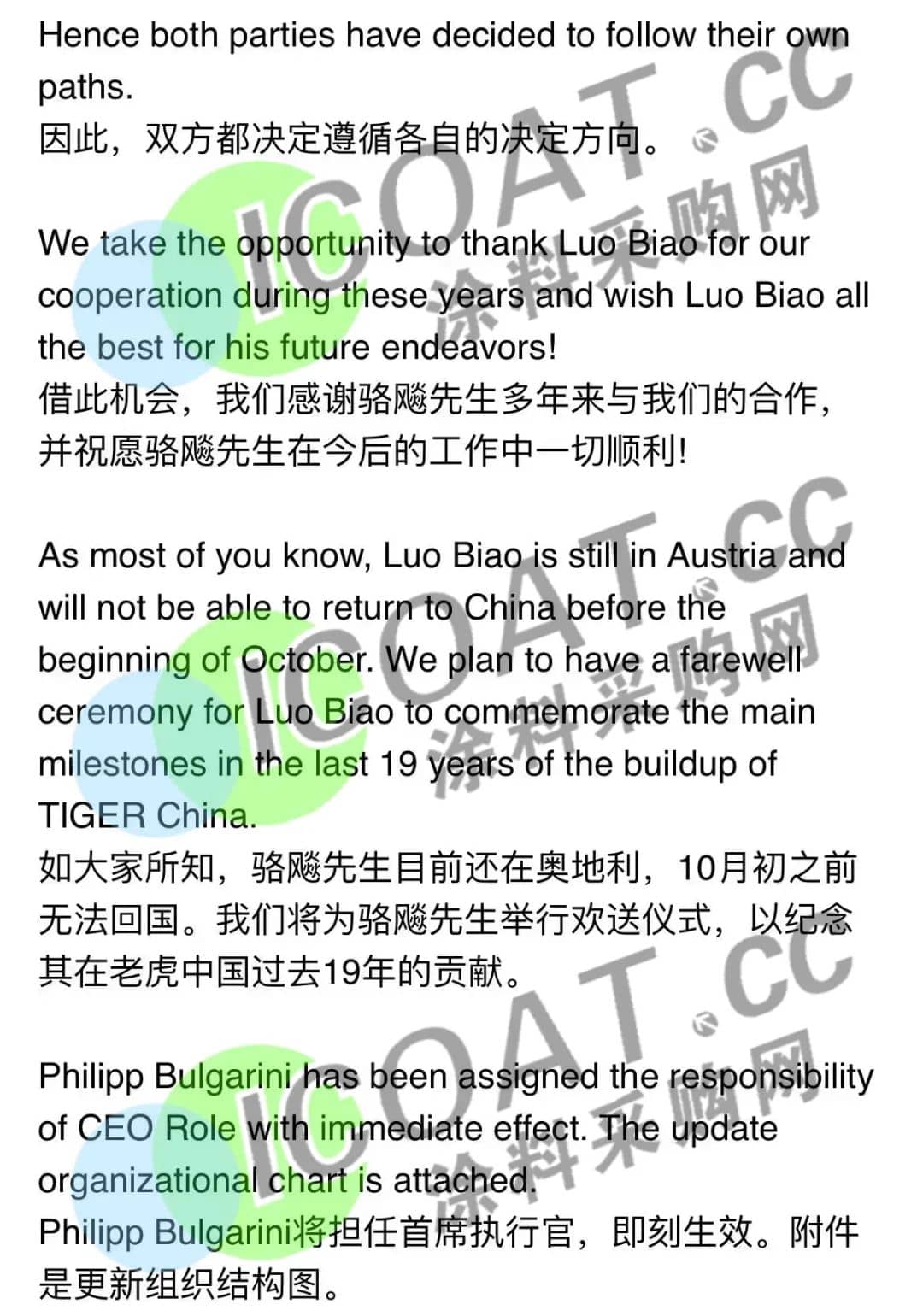 據涂料采購網消息,2022年9月19日,老虎新材料總部發布一份名為《IMPORTANT information:TIGER and Luo Biao by mutual agreement will take seperate paths》的內部郵件稱:老虎董事會認為老虎中國發展戰略與駱飚先生的職業規劃無法達成一致,駱飚先生將離開老虎新材料,Philipp Bulgarini 將擔任首席執行官。
