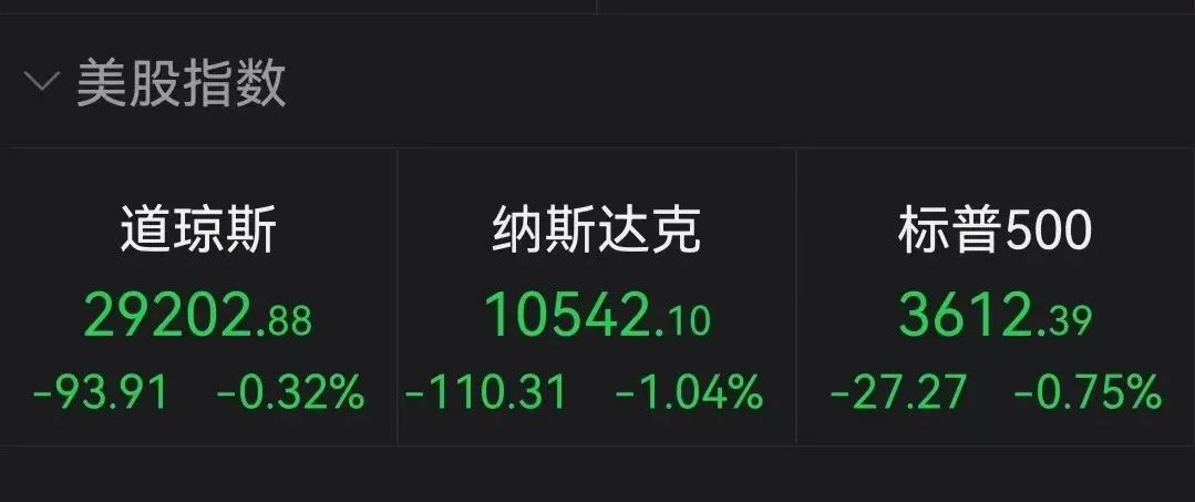 當地時間10月10日,美股三大股指高開后再度走低,均連續4個交易日下跌。截至收盤,美股道指跌0.32%,報29202.88點;納指跌1.04%,報10542.10點;標普500指數跌0.75%,報3612.39點。