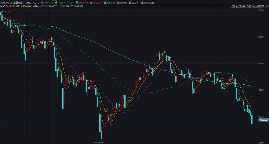 國內股市也一片飄綠,國慶假期結束后首個交易日,滬指跌破3000點大關。上一次跌破3000點,是2022年4月25日。截至收盤,上證指數報收2974.15點,下跌1.66%,跌破3000點重要整數關口。深證成指報收10522.12點,跌幅2.38%,創業板指下跌2.30%,滬深300下跌2.21%,科創50跌幅更達到4.48%。