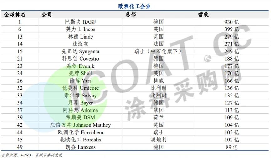 歐盟是全球第二大化工品生產地區,擁有巴斯夫、液化空氣、拜耳、科思創、朗盛等眾多化工巨頭。2022年全球化工企業50強中,歐洲地區就有18家,預計減產將會對基礎化工原材料供應產生影響。