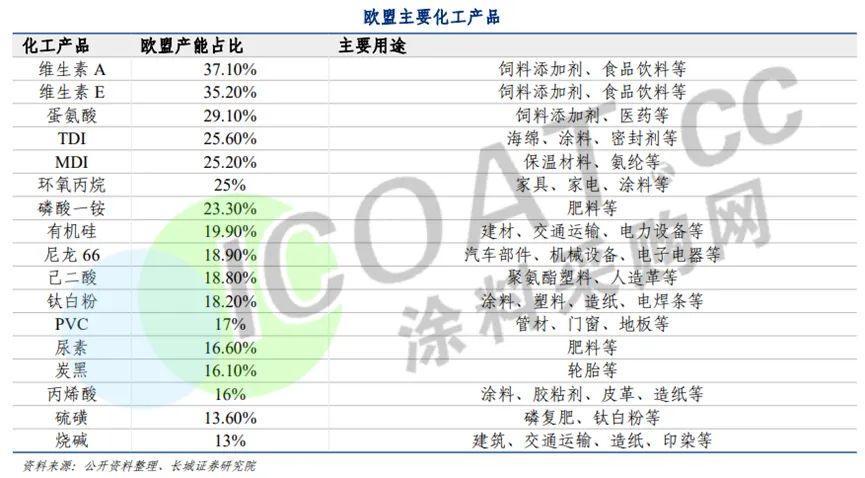 歐洲生產的化工產品主要流向東北亞、東南亞、中東和北美。一些化學品在全球市場有主導作用,如MDI、TDI、苯酚、辛醇、高端聚乙烯、高端聚丙烯、環氧丙烷、氯化鉀A、維生素E、蛋氨酸、丁二烯、丙酮、PC、新戊二醇、EVA、苯乙烯、聚醚多元醇等。