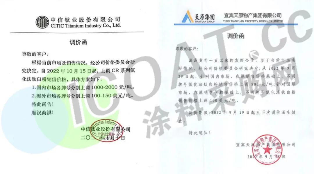 中信鈦業(yè)宣布,CR氯化法鈦白粉國內(nèi)上漲1000-2000元/噸,海外調(diào)漲100-150美元/噸;天原集團(tuán)宣布,氯化法鈦白粉國內(nèi)上漲800元/噸,海外調(diào)漲100美元/噸。