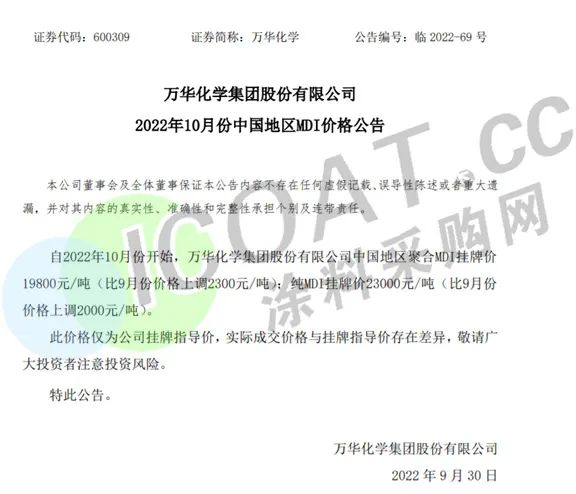 MDI:萬華化學(xué)調(diào)漲2300元/噸