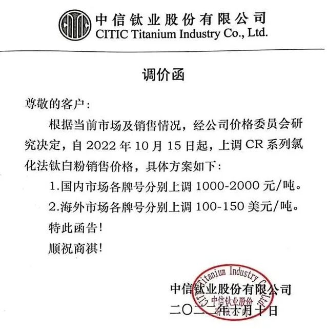 近日中信鈦業發布了調價通知,稱根據當前市場及銷售情況,經價格委員會研究決定,自2022年10月15日起,國內市場各牌號CR系列氯化法鈦白粉銷售價格上調1000-2000元/噸,海外市場各牌號CR系列氯化法鈦白粉銷售價格上調上調100-150美元/噸。