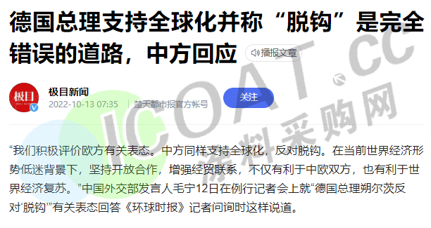 當地時間10月11日,德國總理朔爾茨在出席柏林機械工程峰會時,再次明確表態支持全球化,稱是全球化“讓很多的繁榮成為可能”。朔爾茨堅定反對脫鉤,強調“脫鉤將是完全錯誤的道路”。德國與歐盟必須建立更廣泛、更穩健的貿易關系,非但不能與個別國家脫鉤,而且“必須與包括中國在內的許多國家,與亞洲、非洲和拉丁美洲的新興國家開展貿易”。