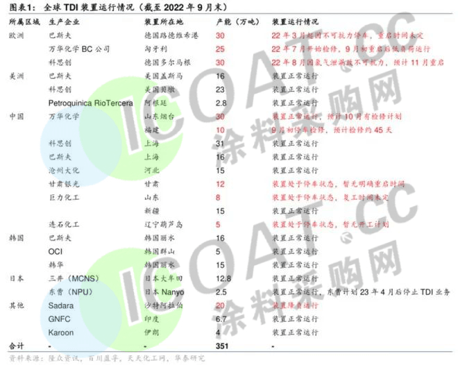目前TDI全球名義產能351萬噸,檢修裝置或面臨檢修裝置產能達182萬噸,占全球TDI總產能的52.88%,也就是說近一半的裝置處于停產狀態(tài),全球TDI面臨供給緊張格局。
