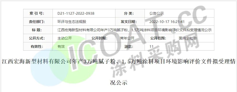 江西宏海新型材料有限公司:年產3萬噸膩子粉、1.5萬噸涂料項目,總投資100萬元。