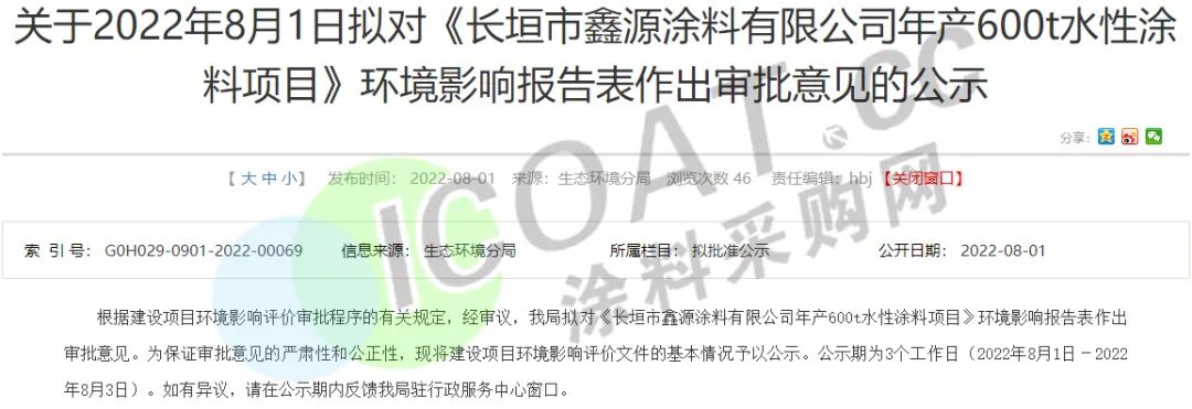 長沙鑫渧濠環保涂料有限公司:年產1100噸水性涂料建設項目,擬投資1000萬元。