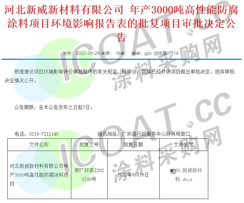 河北新威新材料有限公司:年產3000噸高性能防腐涂料項目,項目總投資300萬元。