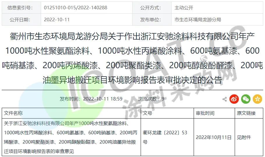 浙江安馳涂料科技有限公司:年產1000噸水性聚氨酯涂料、1000噸水性丙烯酸涂料、600噸氨基漆、600噸硝基漆、200噸丙烯酸漆、200噸聚酯類漆、200噸醇酸酚醛漆、200噸油墨異地搬遷項目。