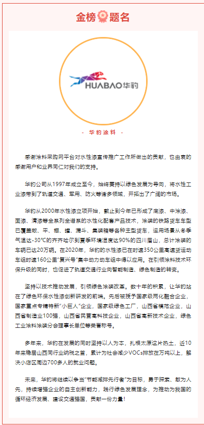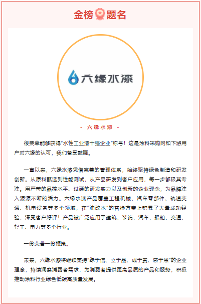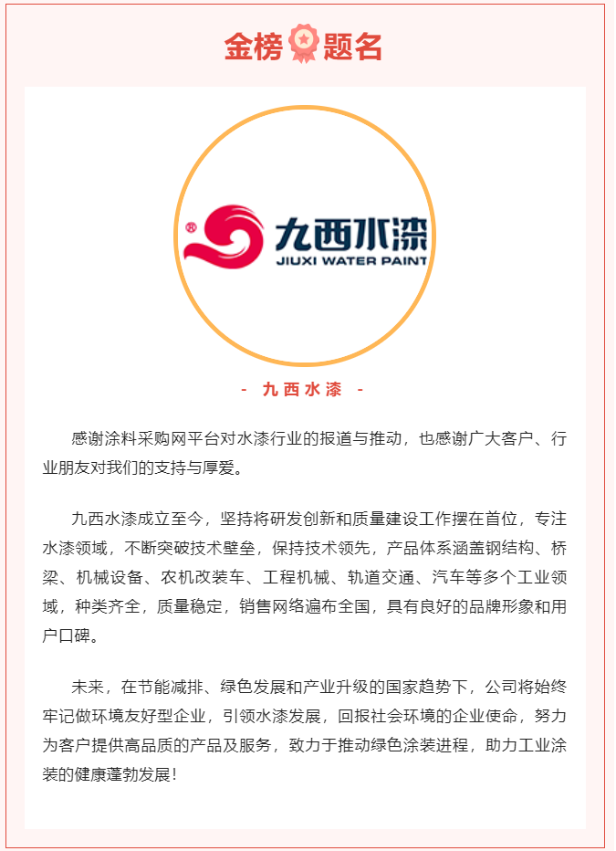 在經過近一年時間的市場調研,并結合線下企業推薦、線上評選、專家團隊評審等多個環節,最終評選出了以長江涂料、華豹涂料、九西水漆、江蘇科祥、海聯涂料、祿源漆業、六緣水漆、擎天材料科技、櫻花水漆、安幸水漆為代表的水性工業漆十強。為機械、工程、橋梁、鋼鐵等多個行業領域提供切實可行的參考。