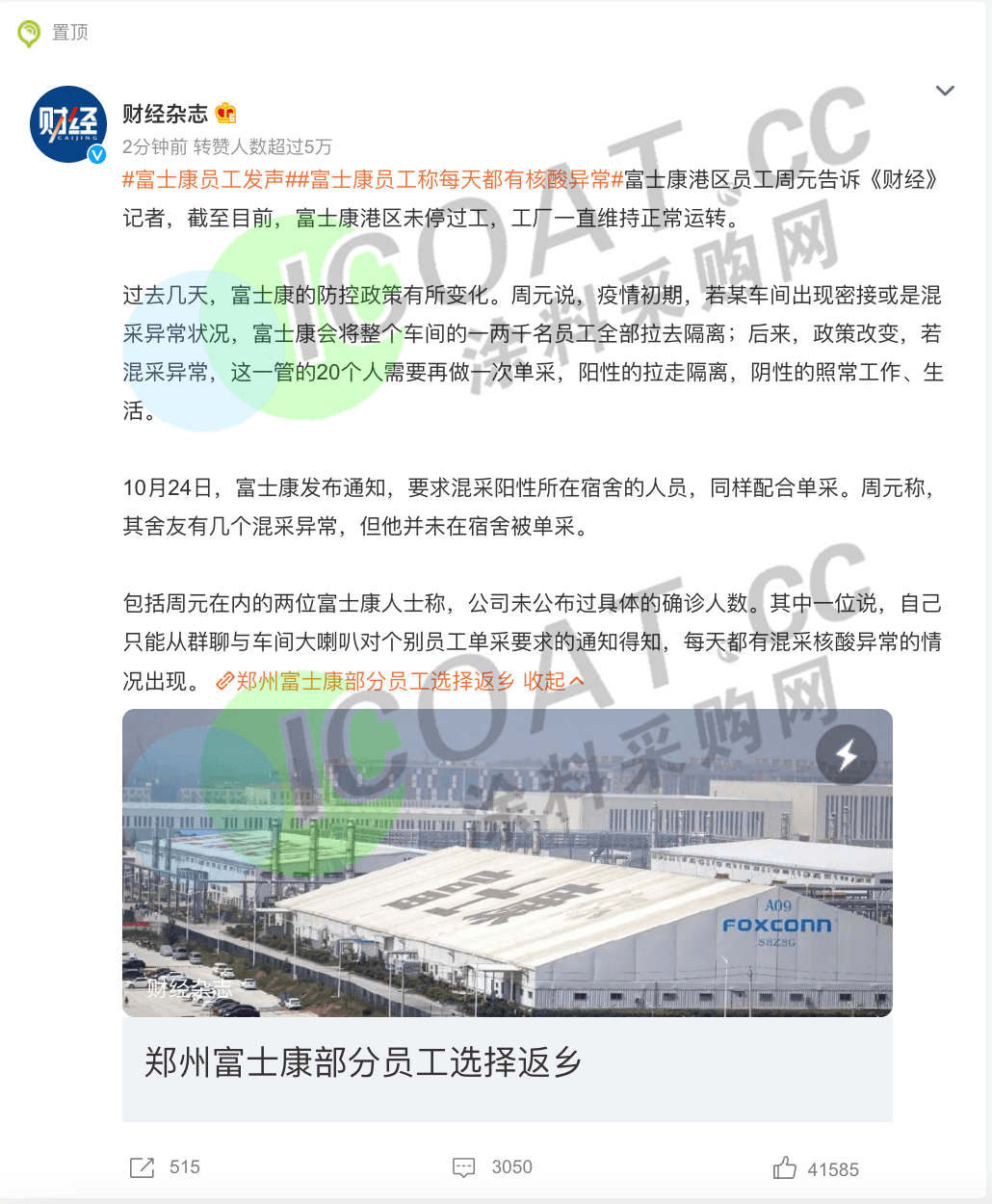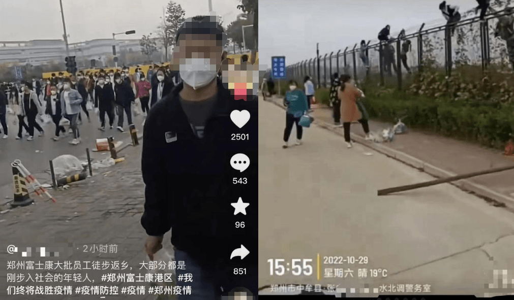 近日,知名電子大廠富士康鄭州工廠大批員工徒步返鄉(xiāng)一事登上熱搜并引發(fā)關(guān)注。網(wǎng)傳視頻顯示眾多員工攜帶行李三三兩兩的走在馬路上,從白天到黑夜依然未見停歇,甚至還有翻越圍墻、鉆出墻洞的員工。而他們徒步百余公里的“大逃亡”無疑源于“鄭州園區(qū)約2萬人確診”的傳聞。