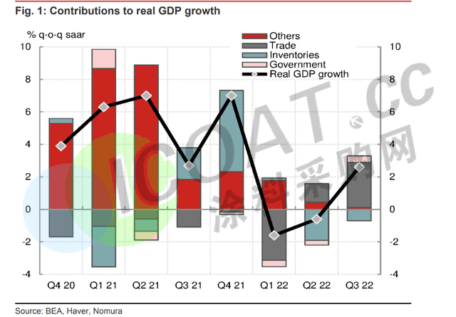 第三季度國內生產總值(GDP)環比折合年率增長2.6%,為2021年第四季度以來新高。同比增長1.9%,三季度GDP達到了6.42萬億美元。實際GDP的增長反映了出口、消費支出、非住宅固定投資、聯邦政府支出以及州和地方政府支出的增長。