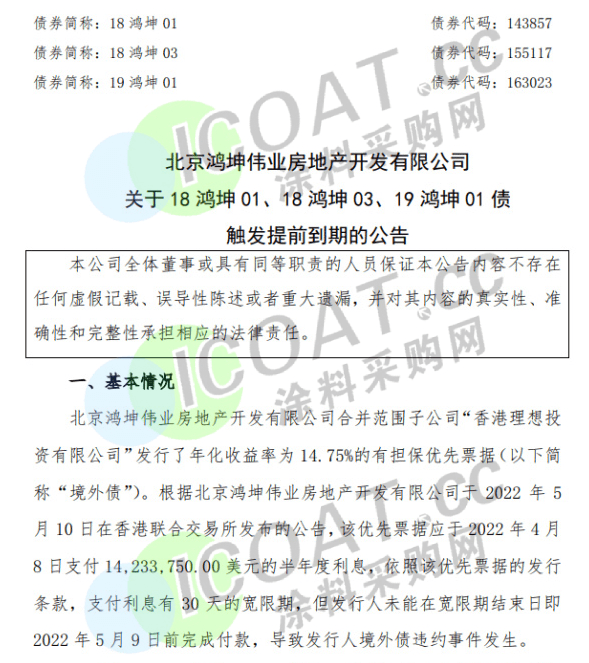 北京鴻坤偉業房地產開發有限公司公告稱,茲涉及BJHKWY 14.75 10/08/22,根據債券的條款,債券的所有未償還本金連同其應計及未付利息將于2022年10月8日到期應付,公司預計不會在到期日支付應付金額。未能在到期日支付本金將構成債券的違約事件,而未能在到期日后30日寬限期屆滿時支付利息亦將構成債券的違約事件。
