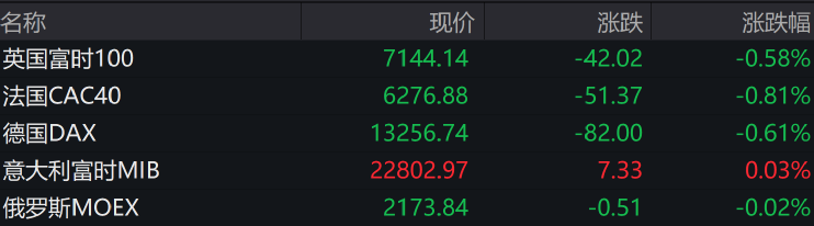 歐洲三大股指收盤同樣全線下跌,德國DAX指數跌0.61%報13256.74點,法國CAC40指數跌0.81%報6276.88點,英國富時100指數跌0.58%報7144.14點。