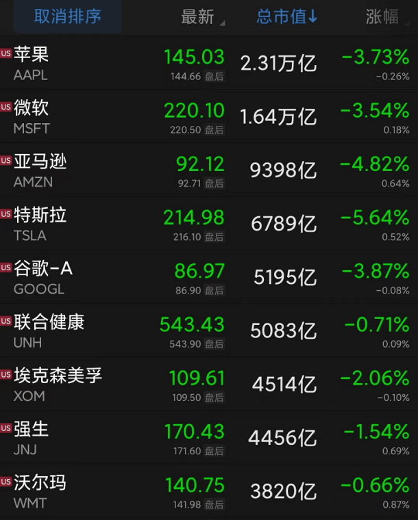 大型科技股全線走低,特斯拉跌逾5%,亞馬遜、臉書母公司Meta跌超4%,蘋果、微軟、谷歌跌超3.5%,英偉達跌2.39%。數據顯示,亞馬遜已經連跌6日,其中5個交易日跌幅超過4%,公司股價今年跌近45%。