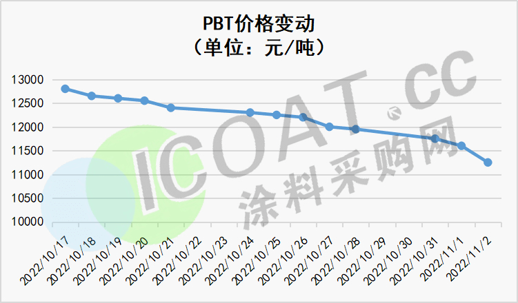 PBT從12800元/噸跌至11250元/噸,報價12連跌,累計下跌1550元/噸,跌幅12.11%。
