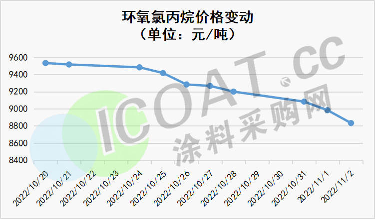 環氧氯丙烷從9533.34元/噸跌至8833.33元/噸,報價9連跌,累計下跌700.01元/噸,跌幅7.34%。