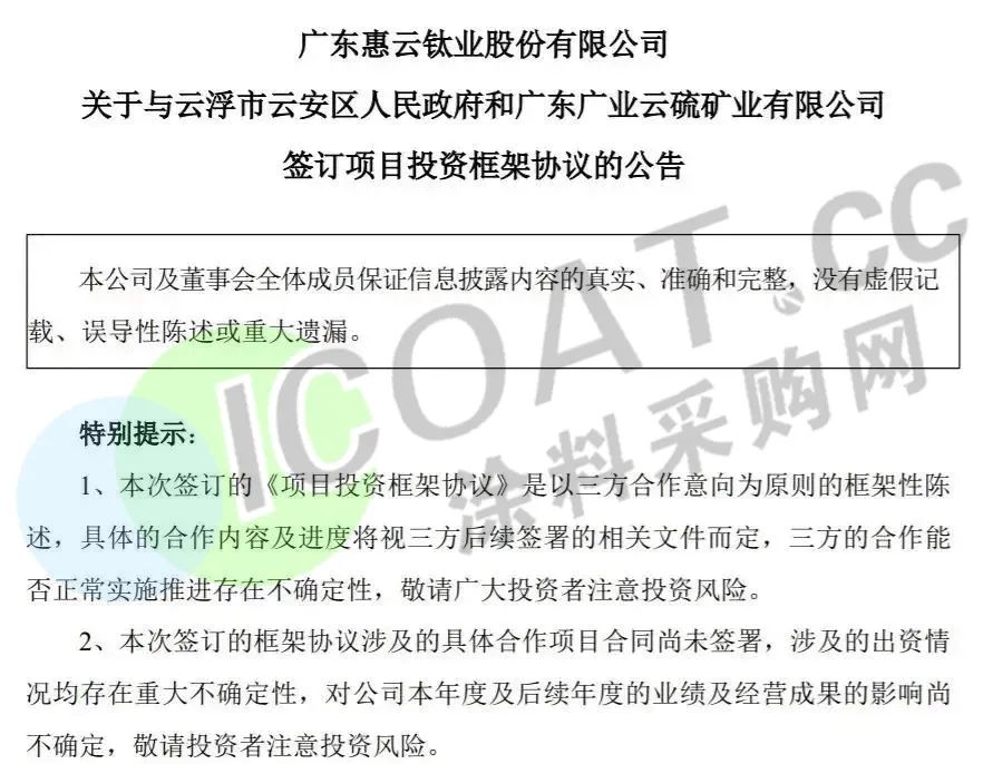 惠云鈦業(yè):與廣東省云浮市云安區(qū)人民政府、云硫礦業(yè)簽訂了《項(xiàng)目投資框架協(xié)議》,打造100億元投資規(guī)模新能源材料產(chǎn)業(yè)園;擬以全資子公司云浮惠云新材料為主體,以自有或自籌資金投資建設(shè)年產(chǎn)10萬噸新能源材料磷酸鐵項(xiàng)目,項(xiàng)目總投資預(yù)計(jì)為63349.60萬元。