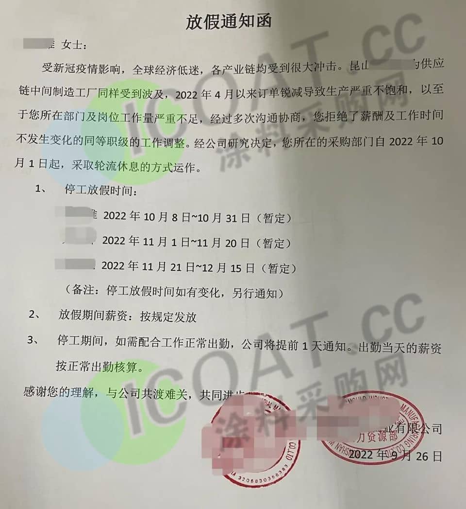 江蘇某企業(yè)表示,由于全球經(jīng)濟(jì)低迷,各產(chǎn)業(yè)鏈均受到較大沖擊,訂單銳減,因此自10月1日起采取輪流休息的方式運(yùn)作。10月8日-10月31日、11月1日-11月20日、11月21日-12月15日停工放假。