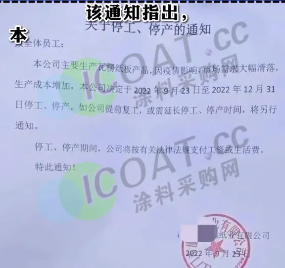 珠三角一紙板廠宣布,市場(chǎng)需求大幅滑落,生產(chǎn)成本增加,決定于9月23日-12月31日停工停產(chǎn)。