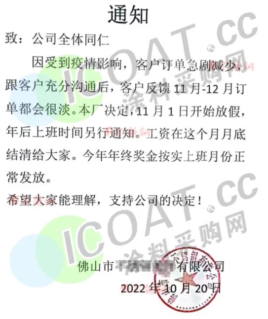 廣東佛山某不銹鋼企業(yè)表示,因受到疫情影響,客戶(hù)訂單急劇減少,決定11月1日開(kāi)始放假,年后上班時(shí)間另行通知。