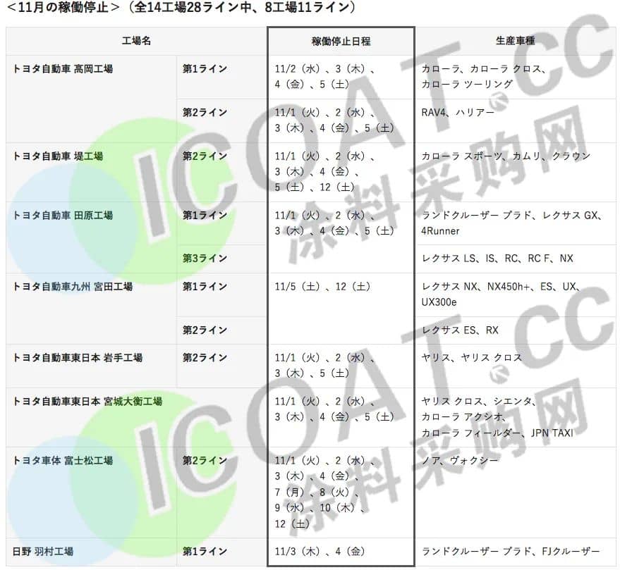 日系車(chē)企豐田汽車(chē)表示,鑒于全球半導(dǎo)體短缺,豐田汽車(chē)預(yù)計(jì)其年產(chǎn)量將低于原定目標(biāo)970萬(wàn)輛。11月豐田汽車(chē)日本本土市場(chǎng)共計(jì)14家工廠28條生產(chǎn)線中,共計(jì)8家工廠,11條生產(chǎn)線面臨不同程度的停產(chǎn)。其中豐田汽車(chē)車(chē)身藤松工廠停產(chǎn)時(shí)間最長(zhǎng),為停產(chǎn)7天,豐田汽車(chē)九州宮田工廠停產(chǎn)時(shí)間最短為2天,受工廠停產(chǎn)影響,受影響的車(chē)輛包括卡羅拉、RAV4、凱美瑞等。