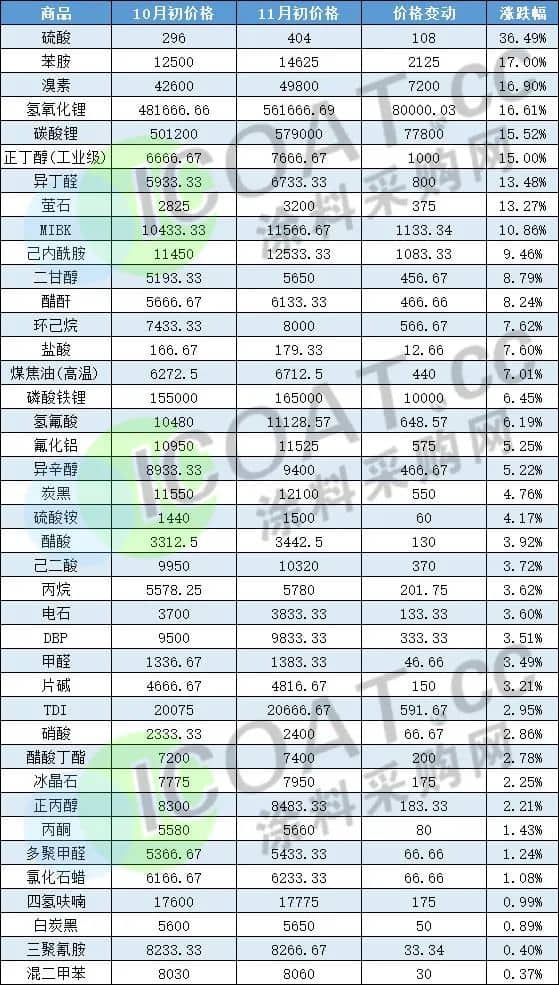 萬華化學丙烯調漲100元/噸,MTBE調漲50元/噸,叔丁醇調漲100元/噸,高純異丁烯調漲200元/噸,二異丁烯調漲100元/噸,TDI產品11月掛牌價格25000元/噸,環比上調3000元/噸;