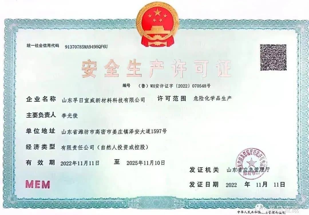 近日,知名涂料企業(yè)山東孚日宣威新材料科技有限公司(或稱“孚日宣威新材料”)再傳喜訊!2022年11月11日,孚日宣威新材料取得山東省應(yīng)急管理廳頒發(fā)的安全生產(chǎn)許可證,標(biāo)志著孚日宣威新材料10萬噸/年軍民兩用功能性涂層材料項目具備生產(chǎn)運營資質(zhì),進入投產(chǎn)階段。