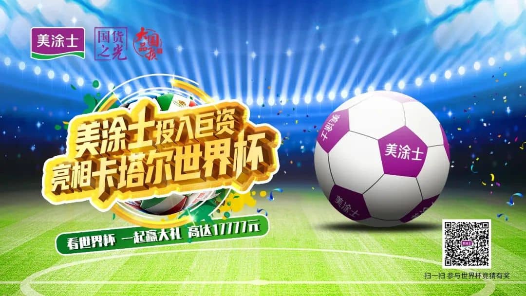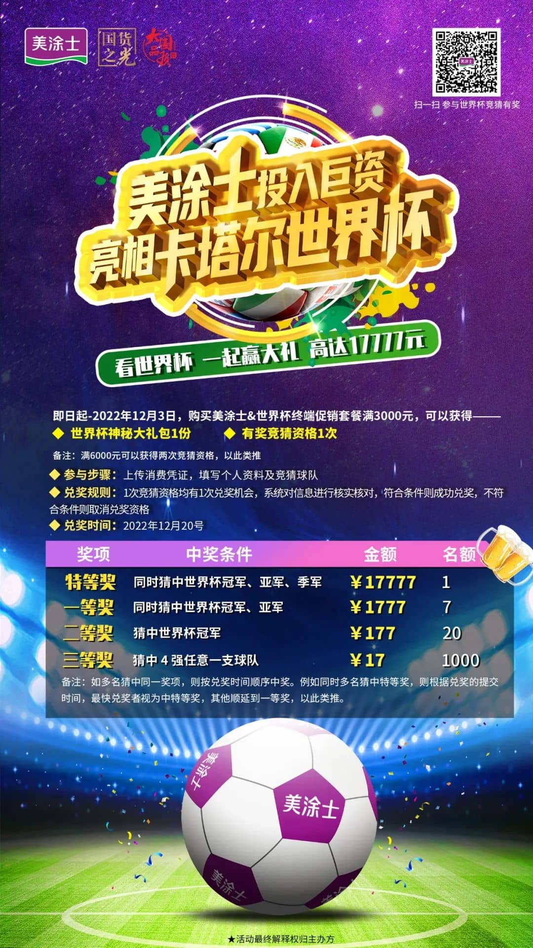 在世界杯期間,美涂士還舉辦了有獎競猜、打卡有禮等多種活動,購買美涂士世界杯終端套餐即可參與,特等獎獎金高達17777元!長按識別以下海報二維碼,跳轉到H5畫面,下滑”點擊競猜“,即可參與哦!
