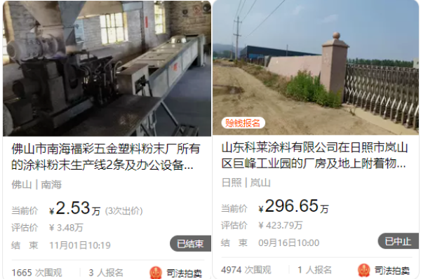 此外法拍的情況也不在少數,這些破產重整的涂料、化工廠或自己選擇變賣財產,或被債權人進行法拍,都走上了一條艱難的路。拍賣的標的包括但不限于涂料、砂漿、膠粘劑等生產線,鐵皮柜、手推車、升降機、塑料桶、電子屏等工廠雜物,以及庫存的涂料產品,甚至還有地毯、工藝品、桌椅和沙發等,值得注意的是,有些企業已經“賒錢”報名了,但仍未拍賣成功,企業最后的一次努力也以失敗告終。