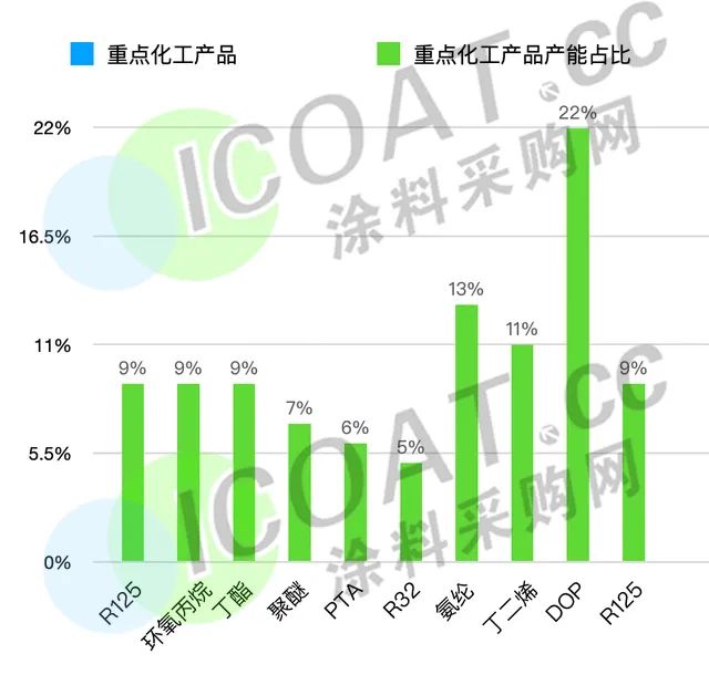 在塑化劑、石化、氟化工、涂料等細分領域,廣東表現(xiàn)亮眼,其中重點化工品產能占比分別為,DOP(22%)、氨綸(13%)、丁二烯(11%)、R125(9%)、環(huán)氧丙烷(9%)、丁酯 (9%)、聚醚(7%)、PTA(6%)、 R32(5%)。