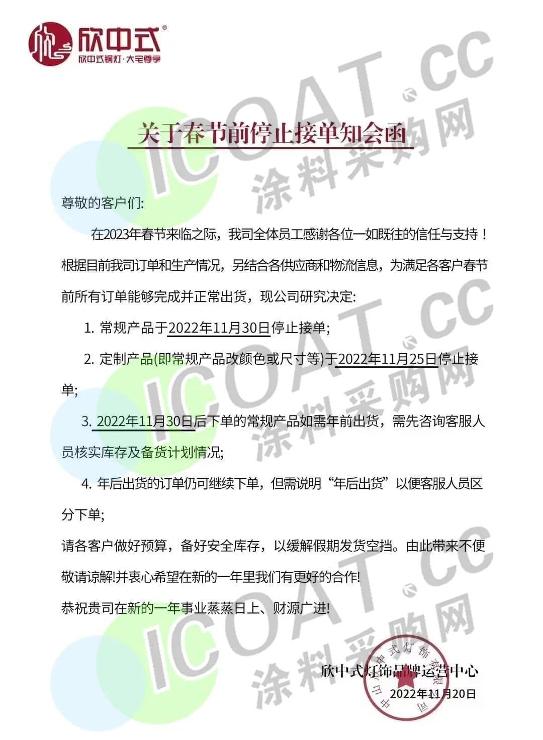 欣中式燈飾發布了《關于春節前停止接單知會函》,稱常規產品于2022年11月30日停止接單;定制產品(即常規產品改顏色或尺寸等)于2022年11月25日停止接單。