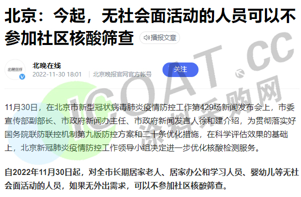 北京自2022年11月30日起,對全市長期居家老人、居家辦公和學習人員、嬰幼兒等無社會面活動的人員,如果無外出需求,可以不參加社區核酸篩查。要全力做好市場保供穩價,涉疫商超、便民網點、前置倉、物流快遞中轉站、大倉等要快封快解,在做好疫情防控工作的同時,確保正常運轉。