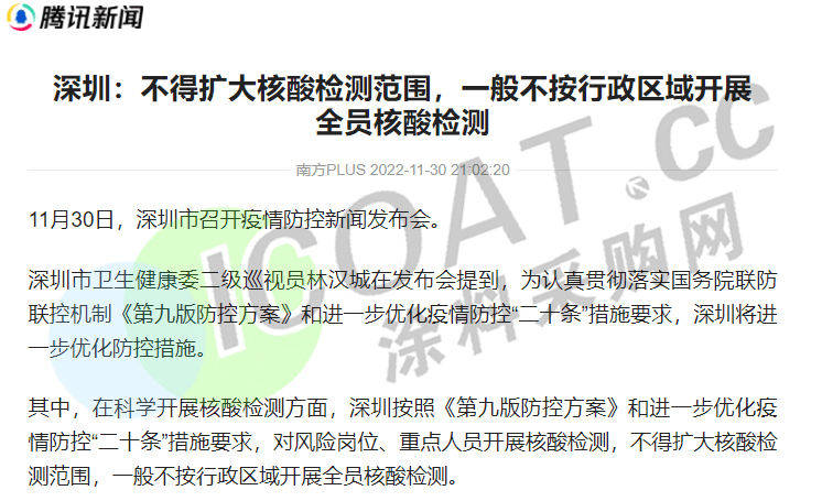 深圳高風險區一般以單元、樓棟為單位劃定,不得隨意擴大。對風險崗位、重點人員開展核酸檢測,不得擴大核酸檢測范圍,一般不按行政區域開展全員核酸檢測。符合解封條件的要及時解封,封控管理要快封快解,應解盡解。及時、準確判定密切接觸者,不得隨意擴大密切接觸者甄別范圍,不以時空伴隨作為判定密切接觸者的標準。